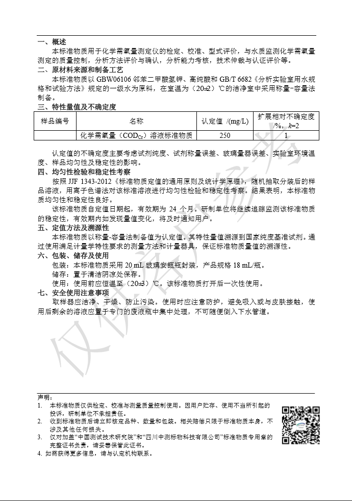标准物质名称 化学需氧量溶液标准物质 标准物质编号 GBW(E)084803 特性量值 5000mg/L 订货周期 7个工作日 相对扩展不确定度 U=1%,k=2 有效期限 24个月 包装 20mL 适用规程/标准 JJG 1012 化学需氧量(COD)在线自动监测仪;JJG 975 化学需氧量(COD)测定仪 此商品可提供浓度定制,每一种浓度起订数量为20支以上,定制周期为15个工作日。下单时,请您在订单附言中备注所需浓度,或与客服联系!