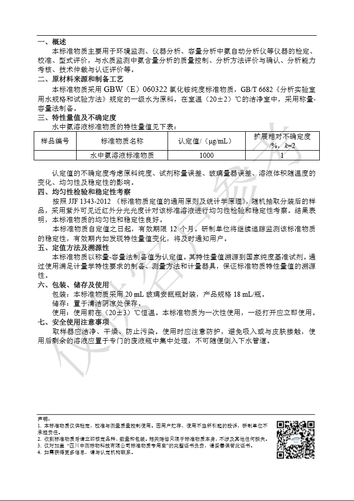 标准物质名称 水中氨溶液标准物质 标准物质编号 GBW(E)082267 特性量值 1000ug/mL