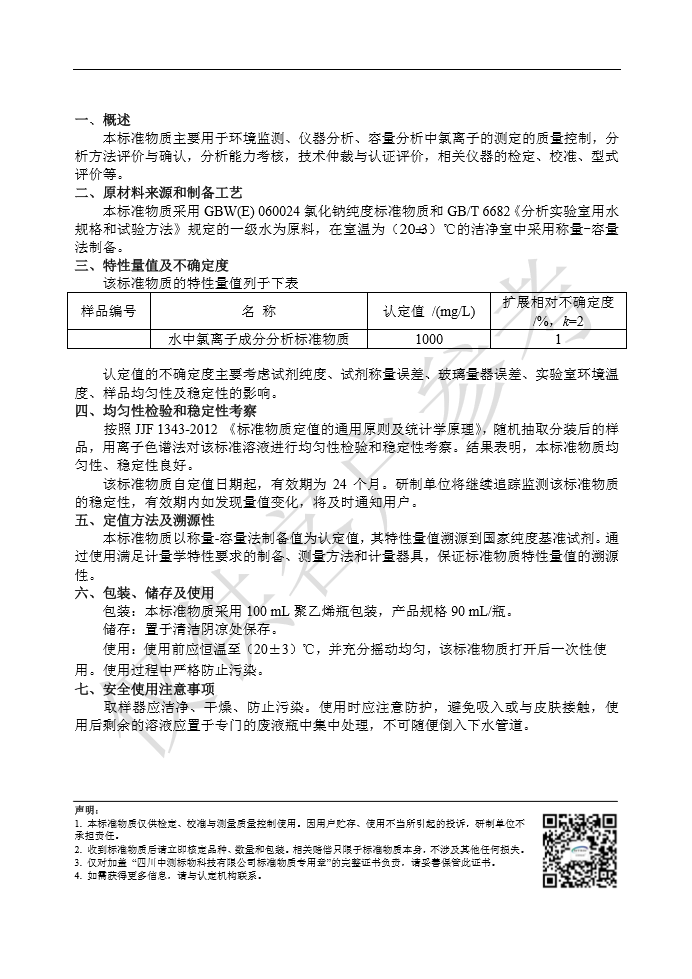 标准物质名称 水中氯离子成分分析标准物质 标准物质编号 GBW(E)082048 特性量值 1000mg/L