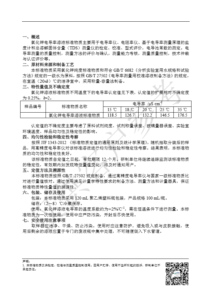 标准物质名称 氯化钾电导率溶液标准物质 标准物质编号 GBW(E)130416 特性量值 146.5uS/cm(25℃)