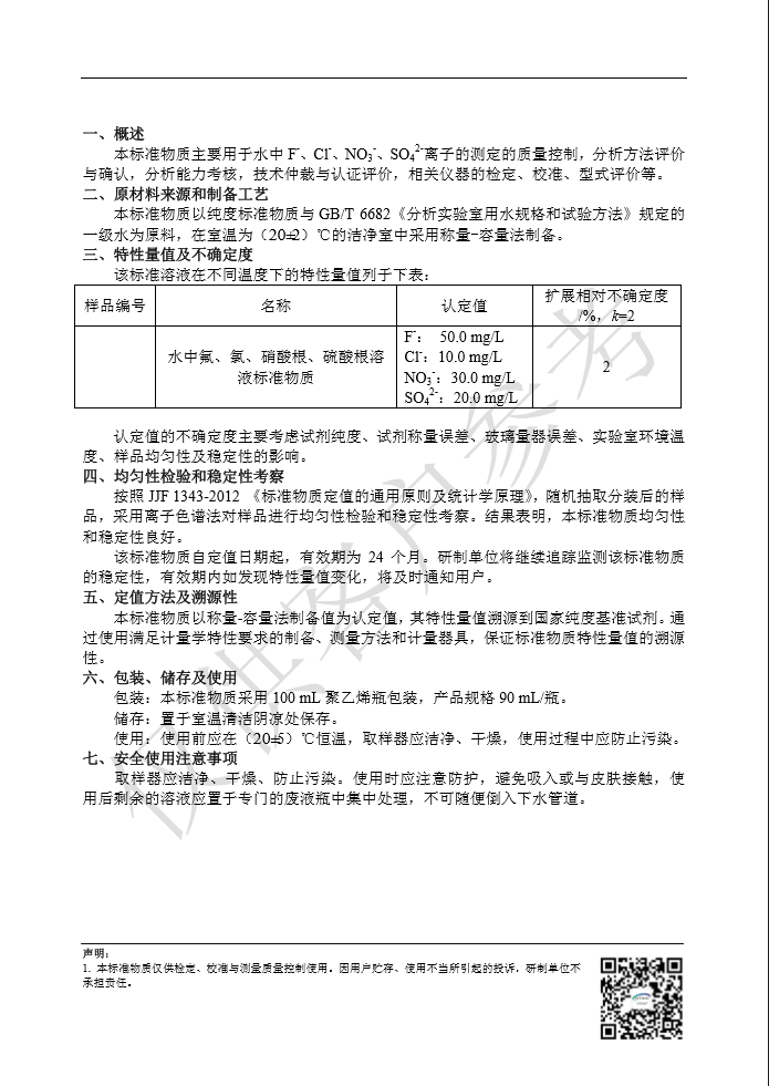 标准物质名称 水中氟、氯、硝酸根、硫酸根离子成分分析标准物质 标准物质编号 GBW(E)082052 特性量值 F: 50.0mg/L ,Cl: 10.0mg/L,NO3: 30.0mg/L,SO4: 20.0mg/L