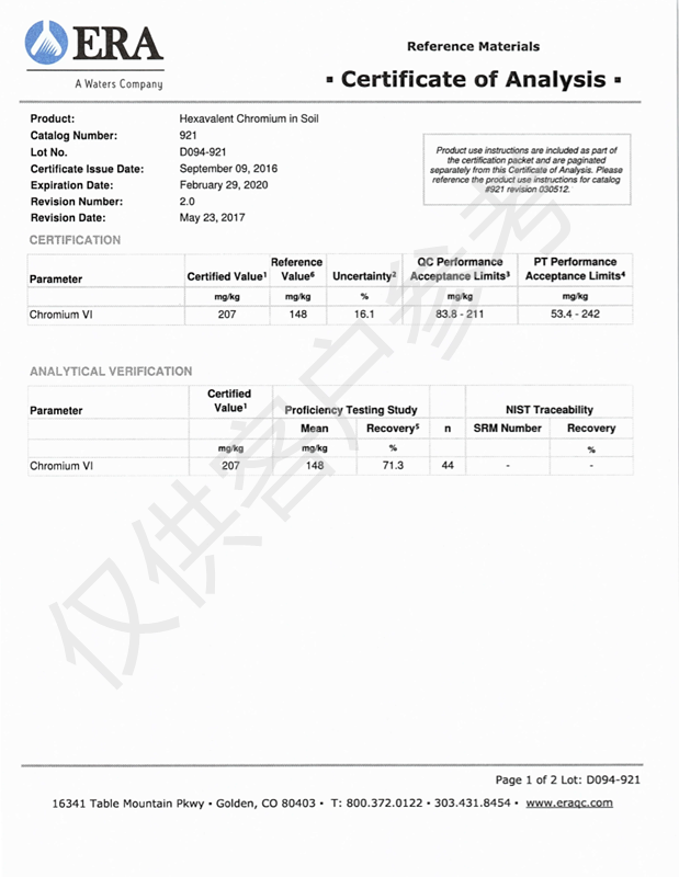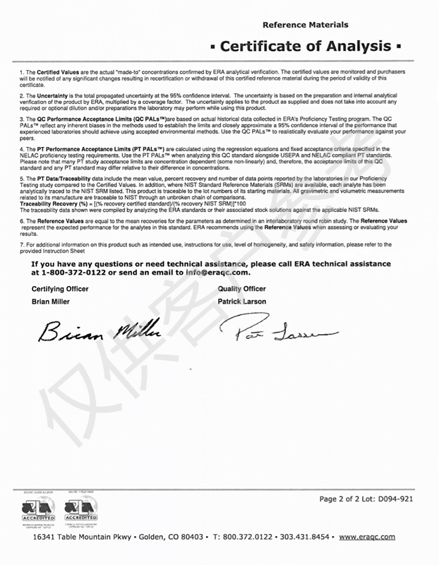 生命科学:ERA公司自2000年在美国开始生产生命科学领域标准品,并在2006年在英国设立分厂,两个工厂均以ISO Guide 34:2008认证为标准,确保为客户提供最高品质的产品,并符合相关认证要求,及文件支持。ERA同时还拥有其它认证,例如ISO 9001:2008;ISO Guide17025:205;以及ISO Guide 17043认证。很少有厂家可以同时按照多个ISO标准执行,然而ERA已经做到了。对于TOC标准品,ERA目前是世界上唯一一家通过标准品级别Guide34认证的企业。
