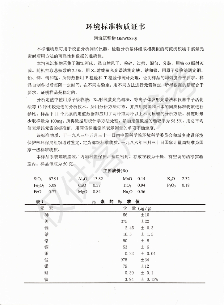 GBW08301湘江河床河流沉积物标准物质