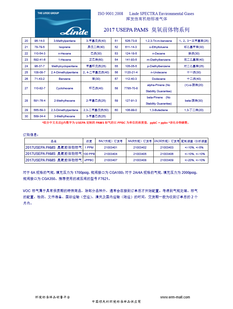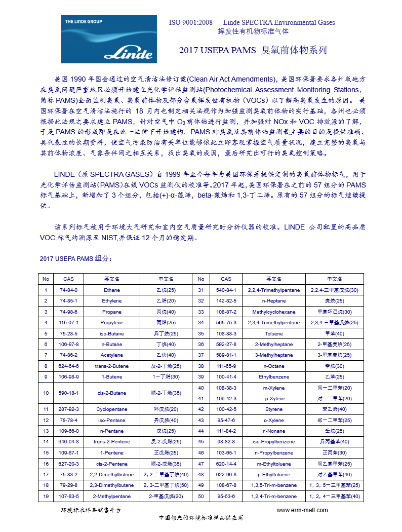 LINDE 2017 USEPA PAMS 臭氧前体物 60组分 标准气体